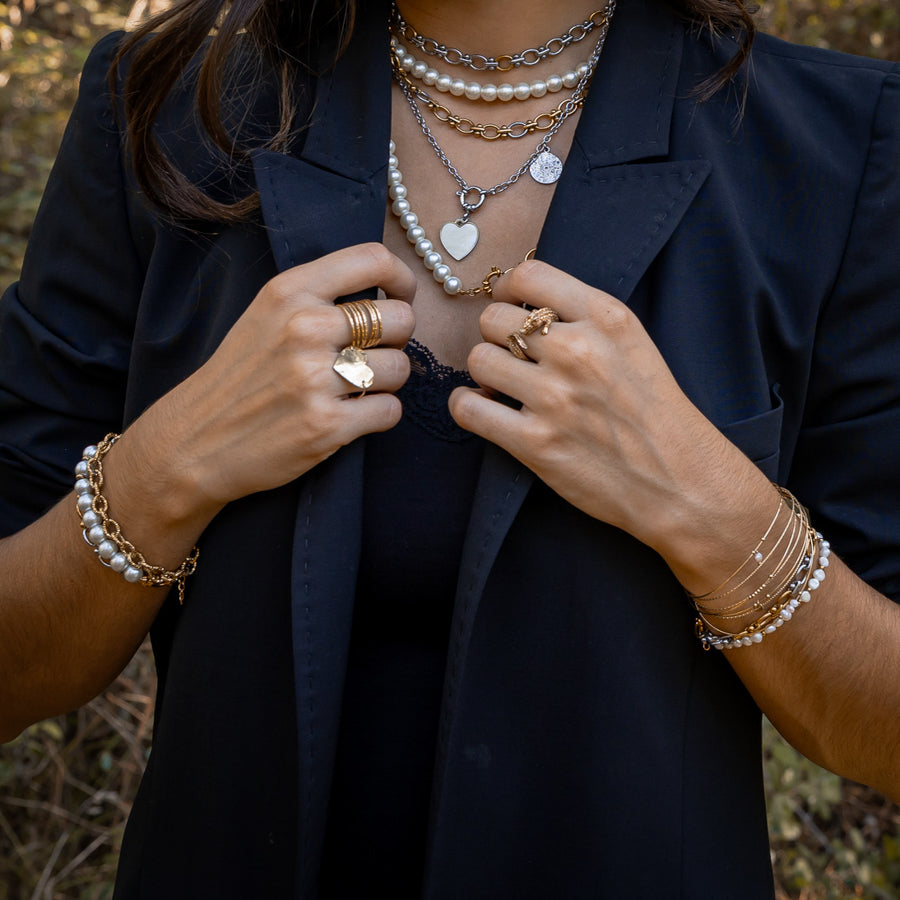 Ce bracelet en perles de verre cirées blanc cassé met en valeur une perle centrale en acier inoxydable doré travaillé, pour un contraste élégant entre brillance et texture. Chaque perle de 8 mm reflète délicatement la lumière, offrant un rendu à la fois doux, chic et intemporel.