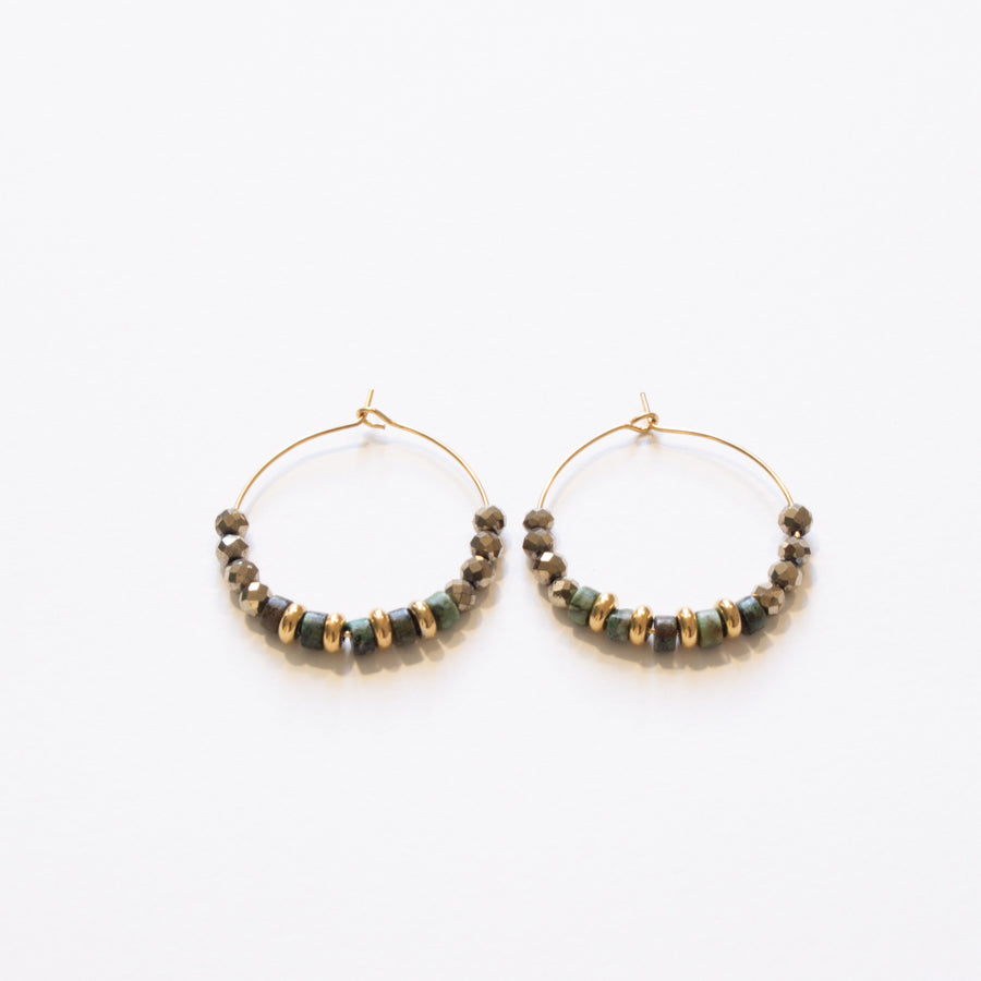 Ces créoles dorées associent deux pierres naturelles complémentaires : la turquoise africaine et l’hématite. Leur contraste harmonieux mêle le bleu-vert doux de la turquoise à la brillance métallique de l’hématite, pour un rendu raffiné et équilibré.